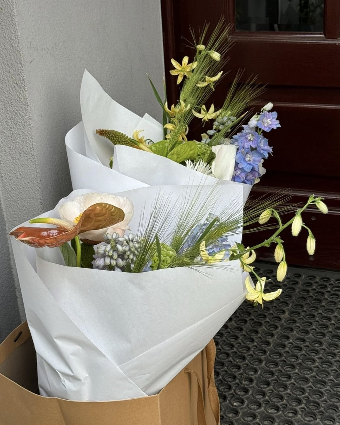 Next-day delivery is available for orders placed by 6 p.m. — bouquets arrive between 1–6 p.m. in a water pack and an elegant paper bag to ensure freshness and a beautiful experience. Each flower bouquet is one of a kind and never repeated, capturing nature’s present moment and the beauty of the season.